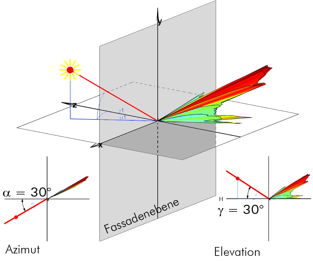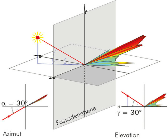 ...in Abhängigkeit von Sonneneinfallswinkeln in horizontaler Lamellenlage. Foto: © Dr.-Ing. Helmut Köster „Tageslichttechnik“Als Nachweisverfahren zu Beleuchtungsstärken kann eine Berechnung mittels der Tageslichtquotienten herangezogen werden. Die BDTF- oder OLDS-Daten (bidirektionale Lichtverteilungsfunktionen Abb. 5) von Lichtlenksystemen ermöglichen eine sehr genaue Ermittlung der Tageslichtquotienten für verschiedene Sonnenstände/Jahreszeiten. Die DIN EN 17037 spricht verstärkt auch die Themen Aussicht, Besonnung und Blendung an: Für die Sichtverbindung nach außen liefert die Norm Qualitätsanforderungen (z.B. Blick auf die Straßenebene oder in den Himmel), bislang ohne die gleichzeitige Durchsichtigkeit der Beschattungssysteme in Prozent zu bewerten.