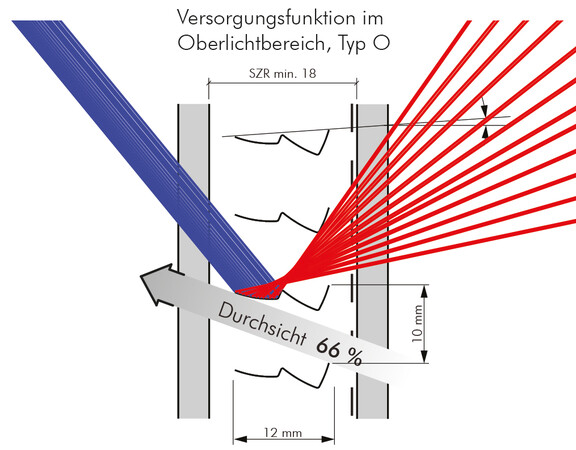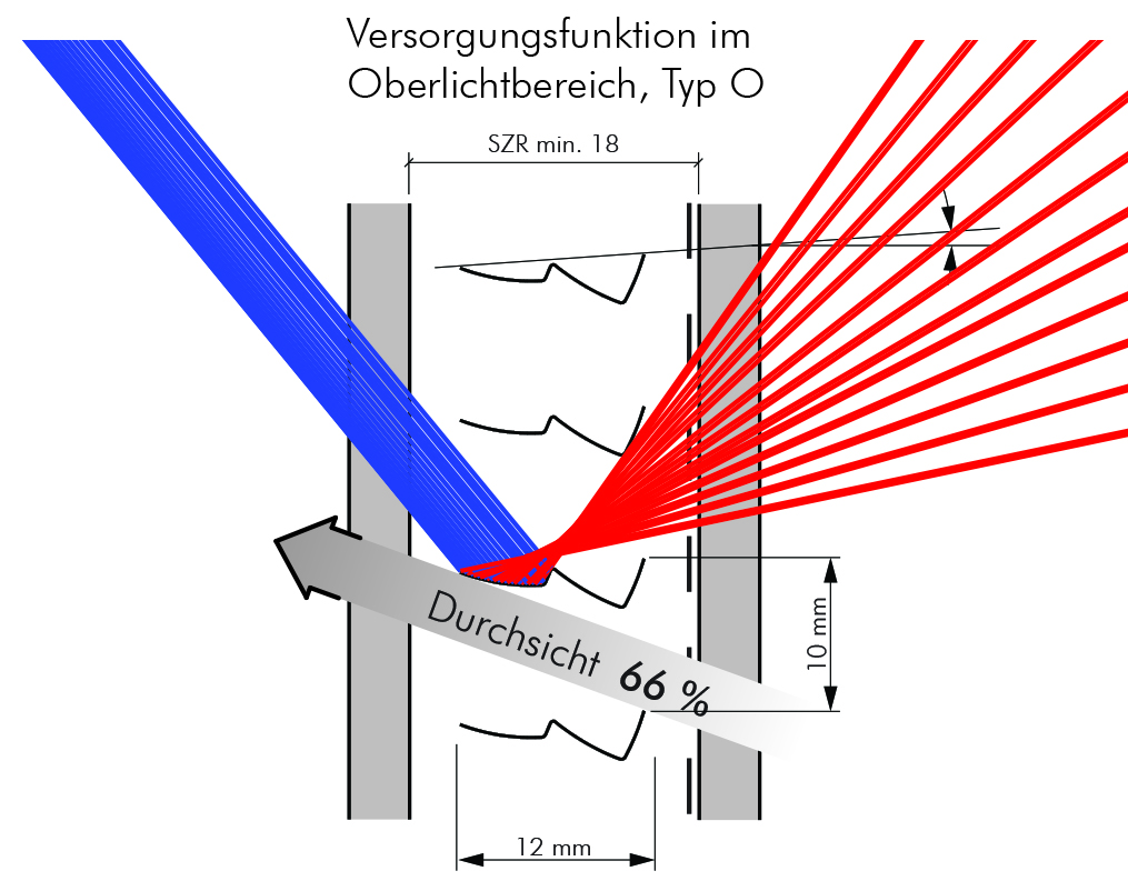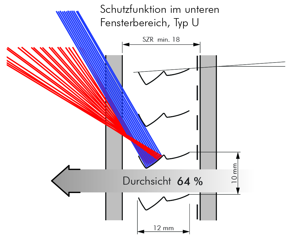 Da die Glasscheiben weit- gehend farbfrei sind (extra clear) und die solare Einstrahlung weitgehend durch die Außenscheibe zurückreflektiert wird, heizt sich die Innenscheibe wenig auf, so dass qi (sekundäre Wärmeabgabe nach innen) sehr gering ist. Die Intelligenz des optischen Lamellensystems liegt in der präzisen Strahlenführung, die es erlaubt, den Behang im Sommer in horizontaler Lamellenstellung – also mit optimaler Durchsicht – zu belassen, so dass trotz des niedrigen g-Wertes gleichzeitig der Außenbezug (Durchsichtigkeit) gesichert ist, wie in der DIN EN17037 und DIN 14501 sowie in den Europäischen Richtlinien 89/654/ EWG und 89/391/EWG thematisiert.